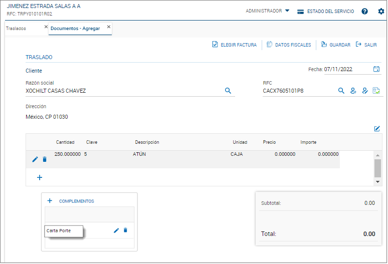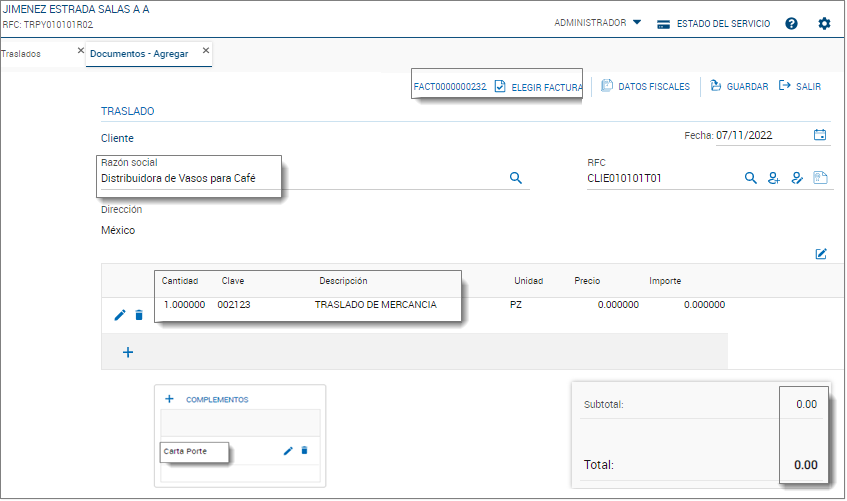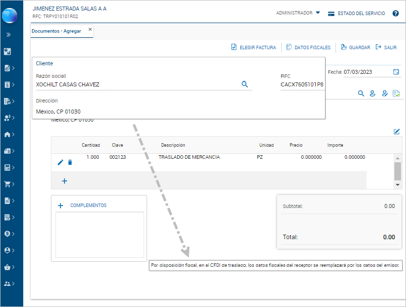 Al realizar un documento de traslado aparecerá un mensaje en donde se comunicará que de acuerdo a disposición fiscal, todos los documentos de traslado el CFDI se generará con los datos del emisor. Esto aplica tanto si se tiene o no el complemento carta porte.