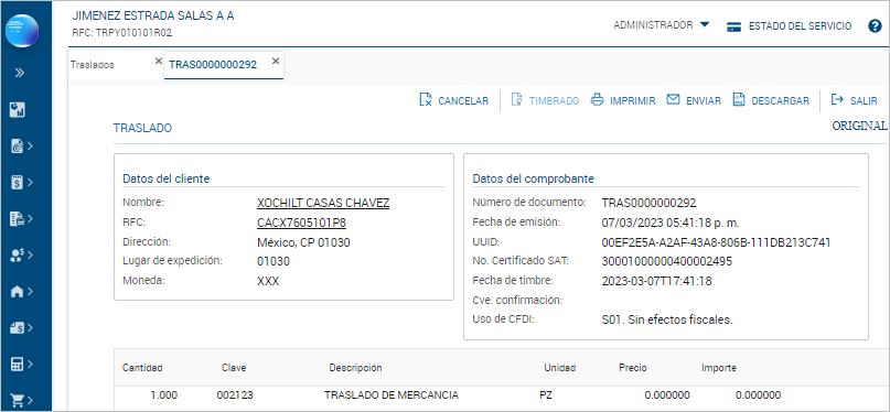 2. Da de alta un documento traslado y visualiza como se genera el PDF y XML