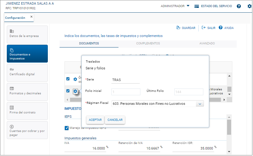 Selecciona el documento traslado y realiza la configuración de este para que lo utilices en el sistema.