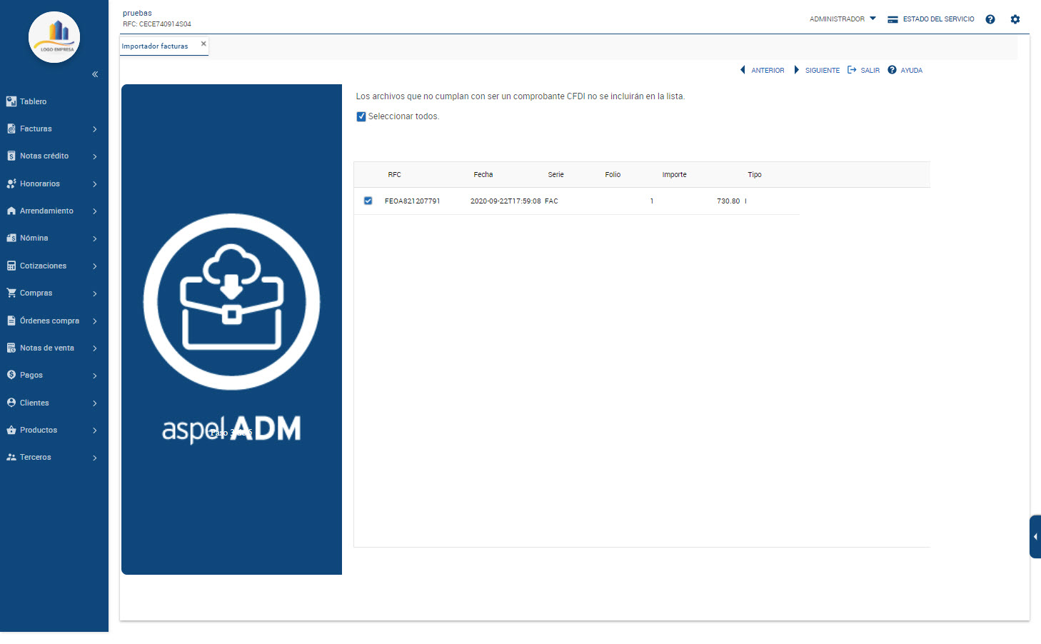 Es un asistente que realizará la selección de archivos CFDIS para importarlos al sistema de aspel ADM, así como extraer información del cliente o producto dependiendo de su configuración.