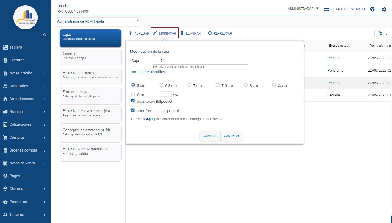 Nota: CoDi se configura desde ADM WEB, pero el proceso se realiza desde Notas de ventas de ADM Tienda.
